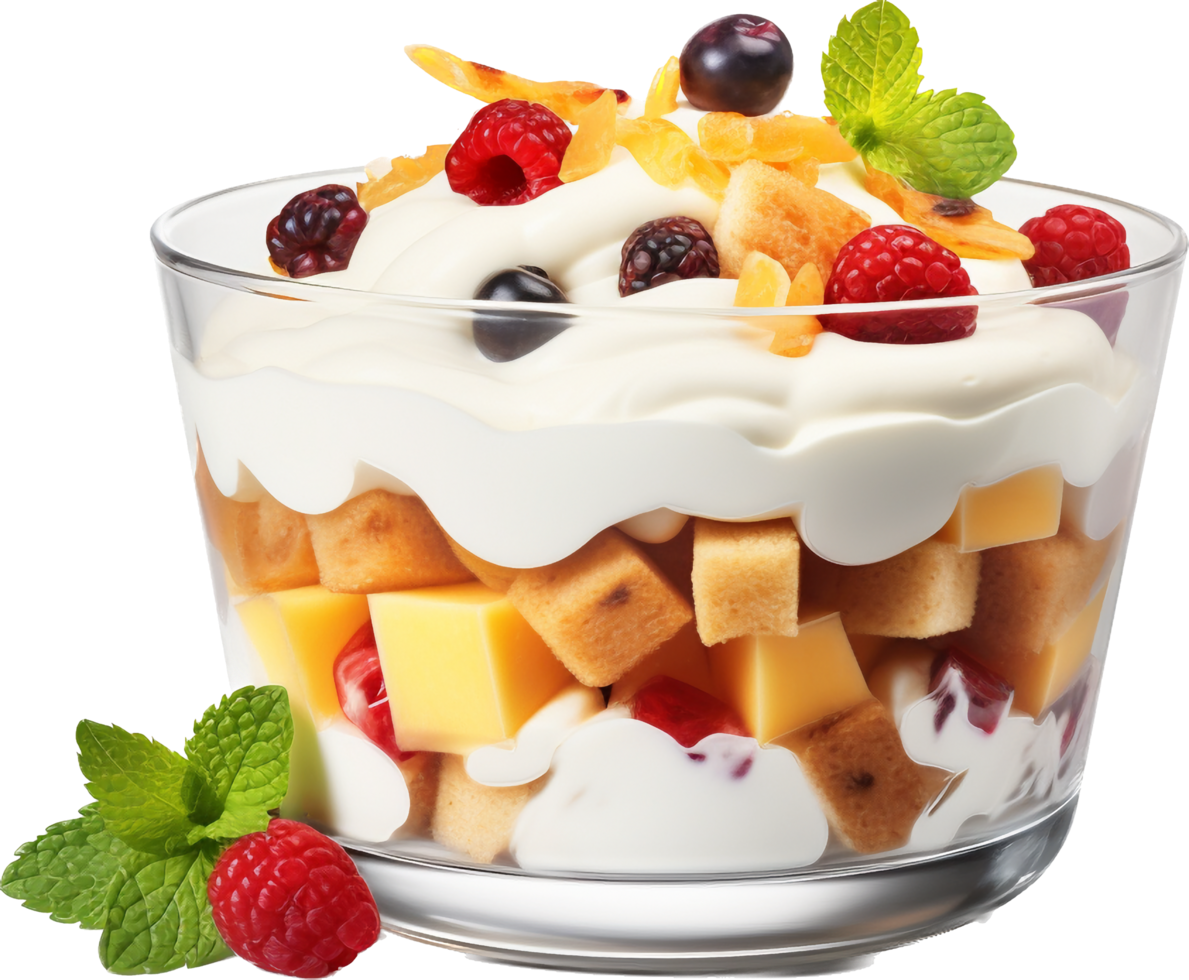 Layered custard dessert with fruits, jelly, and cake — a colorful treat!